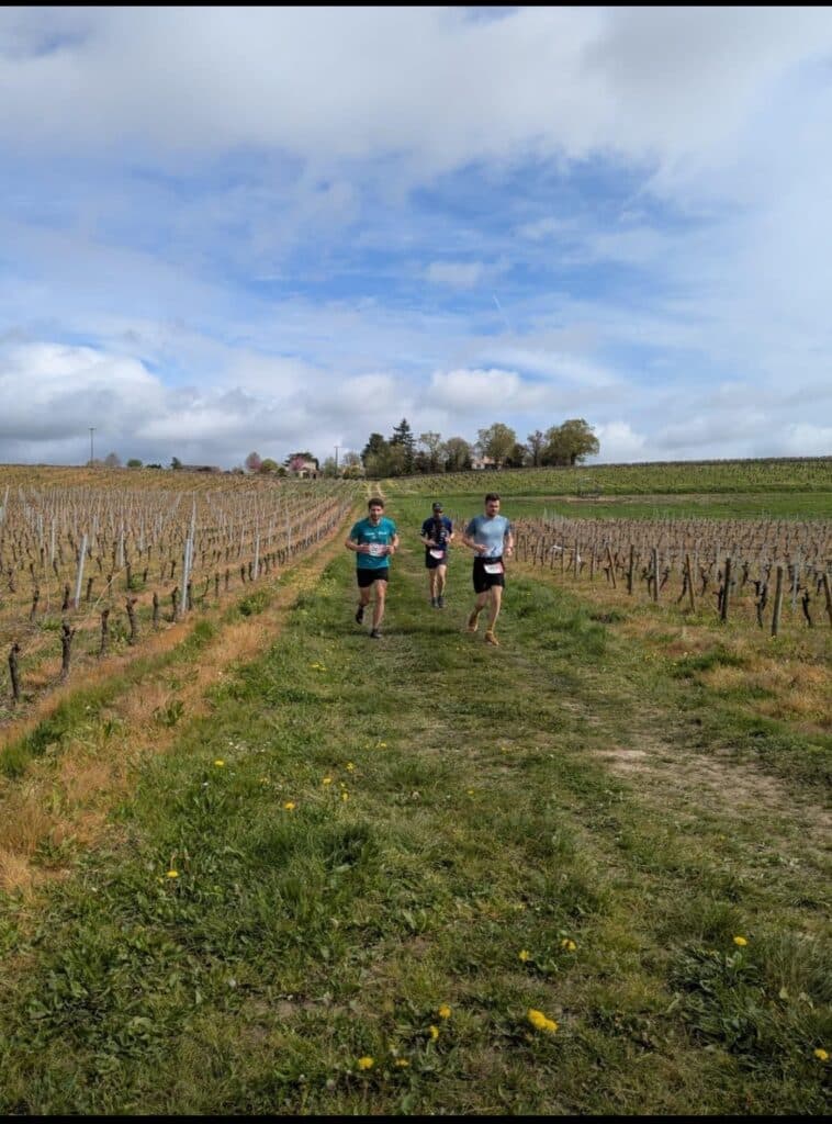 La première boucle sera l’occasion de découvrir le parcours. Il fait 7km pile, environ 100m d+ comme annoncé et hormis le “Mur de St Fiacre” situé dès le départ, il n’y a pas de grosses difficultés. On traverse les champs de vignes, puis un sous-bois près du château du Coing, avant de retrouver les vignes. On termine le tour par une longue ligne droite plane, d’environ 1.5km. Celle-ci me semble interminable.